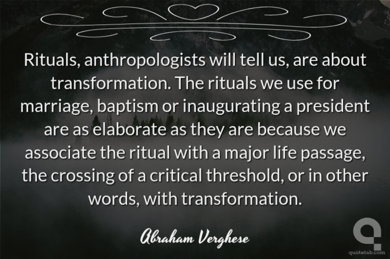 Rituals, anthropologists will tell us, are about transformation. The rituals we use for marriage, baptism or inaugurating a president are as elaborate as they are because we associate the ritual with a major life passage, the crossing of a critical threshold, or in other words, with transformation. Abraham Verghese