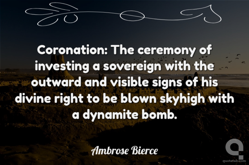 Coronation: The ceremony of investing a sovereign with the outward and visible signs of his divine right to be blown skyhigh with a dynamite bomb. Ambrose Bierce