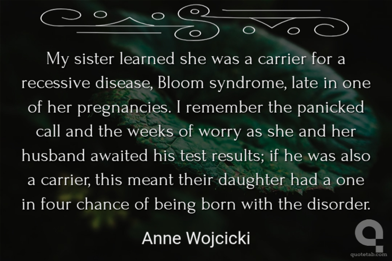 My sister learned she was a carrier for a recessive disease, Bloom syndrome, late in one of her pregnancies. I remember the panicked call and the weeks of worry as she and her husband awaited his test results; if he was also a carrier, this meant their daughter had a one in four chance of being born with the disorder. Anne Wojcicki