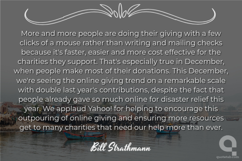 More and more people are doing their giving with a few clicks of a mouse rather than writing and mailing checks because it's faster, easier and more cost effective for the charities they support. That's especially true in December, when people make most of their donations. This December, we're seeing the online giving trend on a remarkable scale with double last year's contributions, despite the fact that people already gave so much online for disaster relief this year. We applaud Yahoo! for helping to encourage this outpouring of online giving and ensuring more resources get to many charities that need our help more than ever. Bill Strathmann