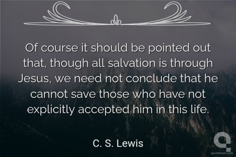 Of course it should be pointed out that, though all salvation is through Jesus, we need not conclude that he cannot save those who have not explicitly accepted him in this life. C. S. Lewis