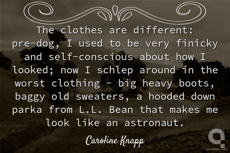 The clothes are different: pre-dog, I used to be very finicky and self-conscious about how I looked; now I schlep around in the worst clothing - big heavy boots, baggy old sweaters, a hooded down parka from L.L. Bean that makes me look like an astronaut. Caroline Knapp
