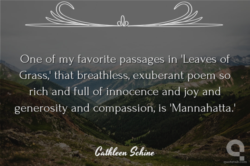 One of my favorite passages in 'Leaves of Grass,' that breathless, exuberant poem so rich and full of innocence and joy and generosity and compassion, is 'Mannahatta.' Cathleen Schine
