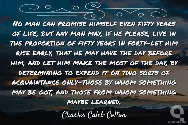 No man can promise himself even fifty years of life, but any man may, if he please, live in the proportion of fifty years in forty-let him rise early, that he may have the day before him, and let him make the most of the day, by determining to expend it on two sorts of acquaintance only-those by whom something may be got, and those from whom something maybe learned. Charles Caleb Colton