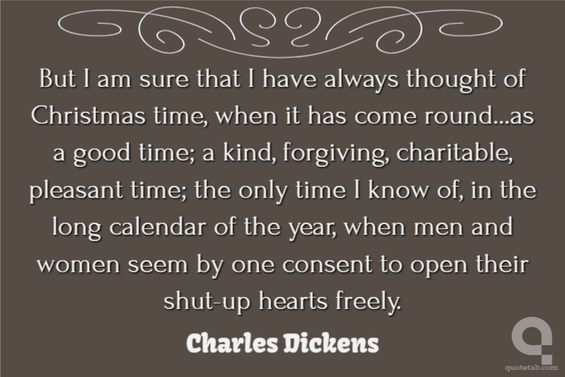 But I am sure that I have always thought of Christmas time, when it has come round...as a good time; a kind, forgiving, charitable, pleasant time; the only time I know of, in the long calendar of the year, when men and women seem by one consent to open their shut-up hearts freely. Charles Dickens