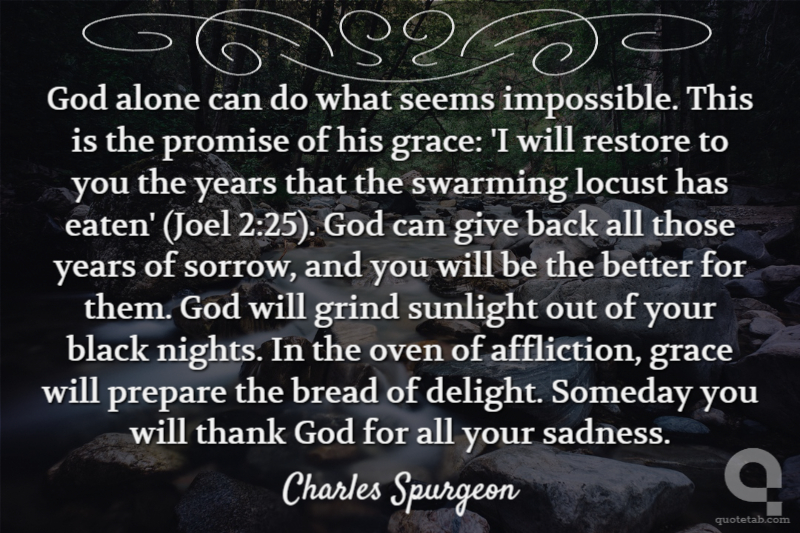 God alone can do what seems impossible. This is the promise of his grace: 'I will restore to you the years that the swarming locust has eaten' (Joel 2:25). God can give back all those years of sorrow, and you will be the better for them. God will grind sunlight out of your black nights. In the oven of affliction, grace will prepare the bread of delight. Someday you will thank God for all your sadness. Charles Spurgeon