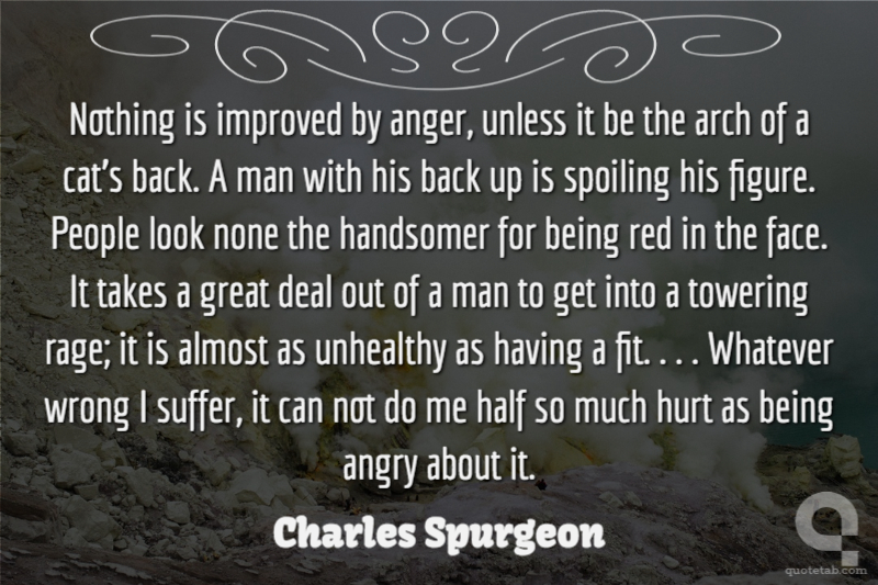 Nothing is improved by anger, unless it be the arch of a cat's back. A man with his back up is spoiling his figure. People look none the handsomer for being red in the face. It takes a great deal out of a man to get into a towering rage; it is almost as unhealthy as having a fit. . . . Whatever wrong I suffer, it can not do me half so much hurt as being angry about it. Charles Spurgeon
