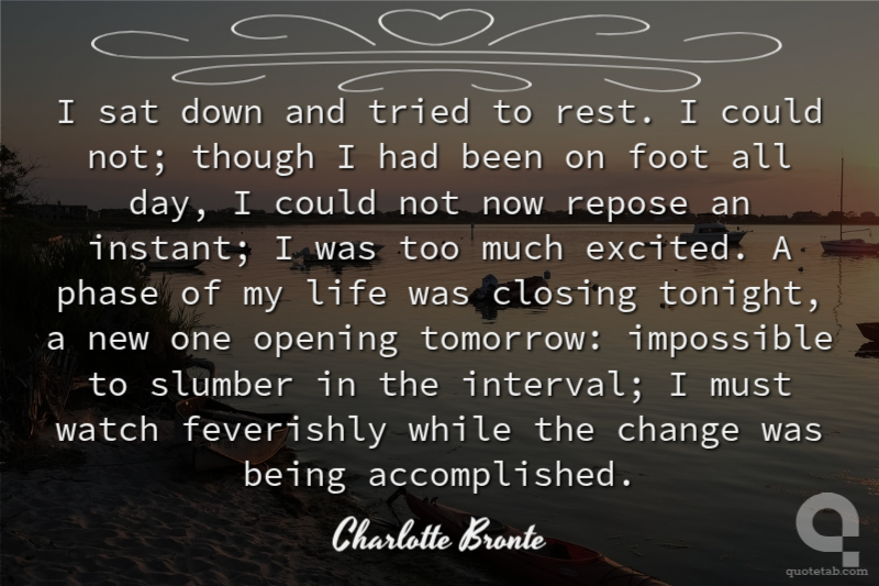 I sat down and tried to rest. I could not; though I had been on foot all day, I could not now repose an instant; I was too much excited. A phase of my life was closing tonight, a new one opening tomorrow: impossible to slumber in the interval; I must watch feverishly while the change was being accomplished. Charlotte Bronte