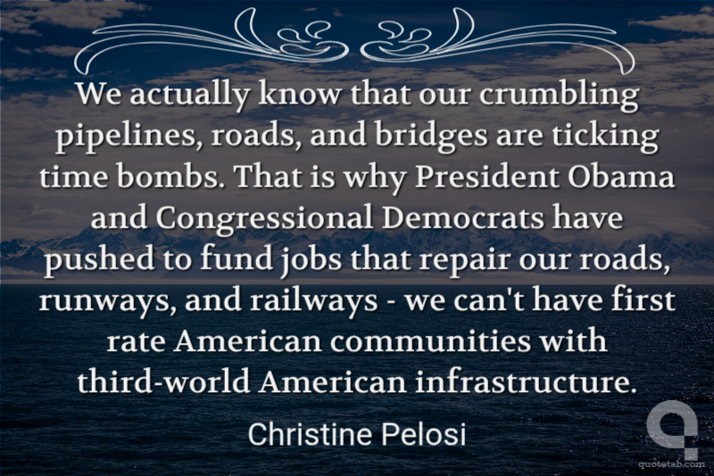We actually know that our crumbling pipelines, roads, and bridges are ticking time bombs. That is why President Obama and Congressional Democrats have pushed to fund jobs that repair our roads, runways, and railways - we can't have first rate American communities with third-world American infrastructure. Christine Pelosi