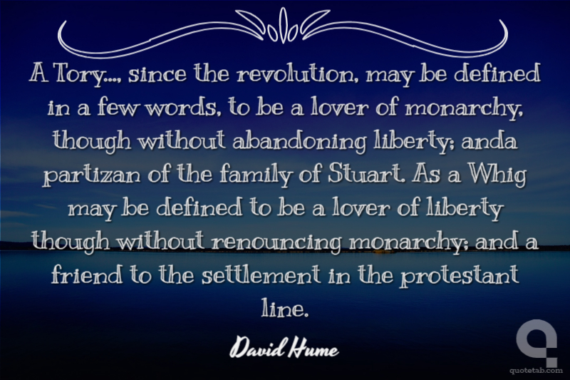 A Tory..., since the revolution, may be defined in a few words, to be a lover of monarchy, though without abandoning liberty; anda partizan of the family of Stuart. As a Whig may be defined to be a lover of liberty though without renouncing monarchy; and a friend to the settlement in the protestant line. David Hume
