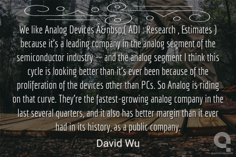 We like Analog Devices  ( ADI : Research , Estimates ) because it's a leading company in the analog segment of the semiconductor industry -- and the analog segment I think this cycle is looking better than it's ever been because of the proliferation of the devices other than PCs. So Analog is riding on that curve. They're the fastest-growing analog company in the last several quarters, and it also has better margin than it ever had in its history, as a public company. David Wu