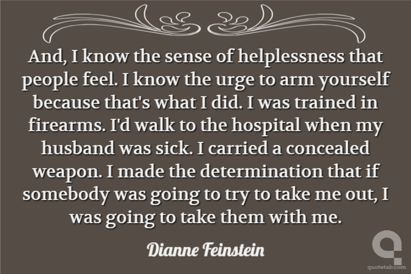 And, I know the sense of helplessness that people feel. I know the urge to arm yourself because that's what I did. I was trained in firearms. I'd walk to the hospital when my husband was sick. I carried a concealed weapon. I made the determination that if somebody was going to try to take me out, I was going to take them with me. Dianne Feinstein