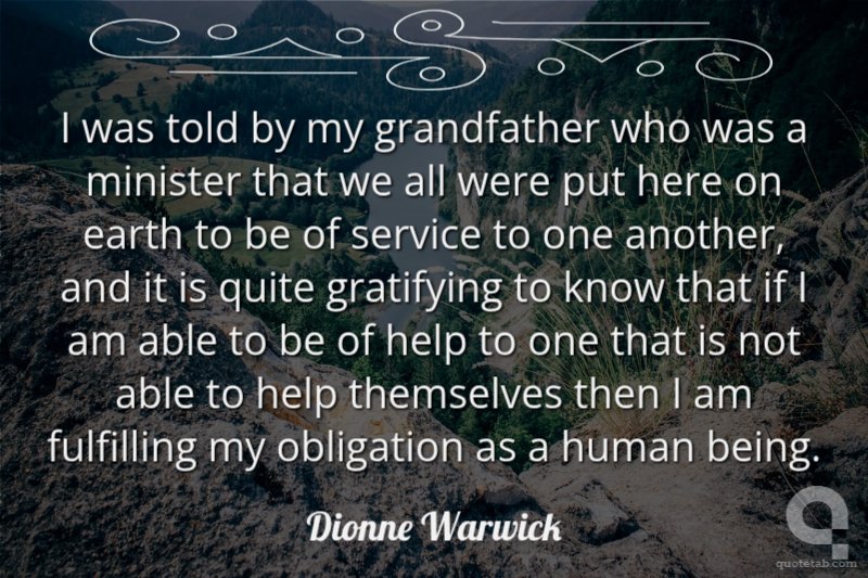 I was told by my grandfather who was a minister that we all were put here on earth to be of service to one another, and it is quite gratifying to know that if I am able to be of help to one that is not able to help themselves then I am fulfilling my obligation as a human being. Dionne Warwick