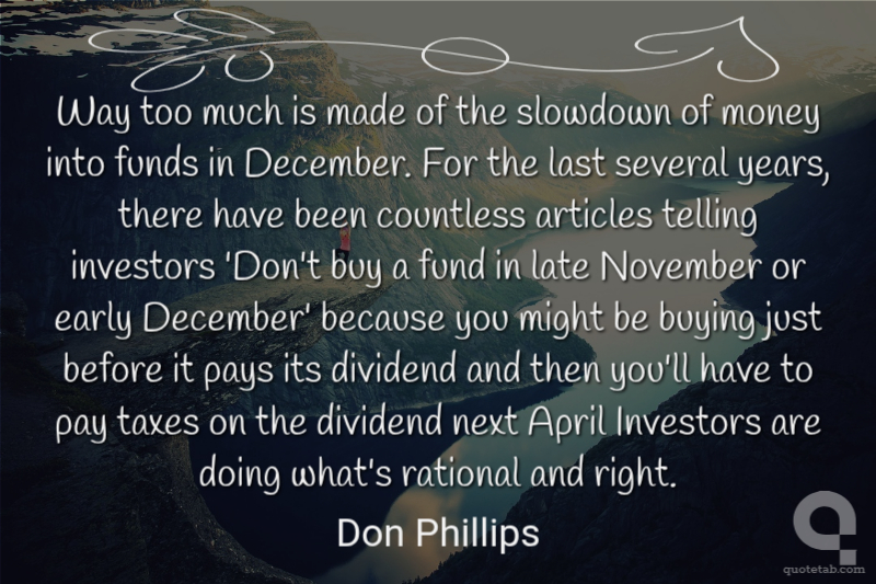 Way too much is made of the slowdown of money into funds in December, ... For the last several years, there have been countless articles telling investors 'Don't buy a fund in late November or early December' because you might be buying just before it pays its dividend and then you'll have to pay taxes on the dividend next April? Investors are doing what's rational and right. Don Phillips
