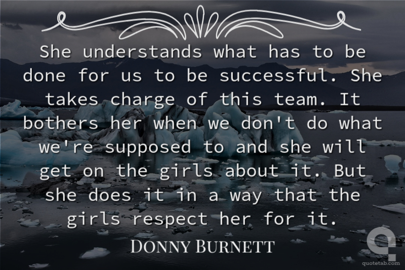 She understands what has to be done for us to be successful. She takes charge of this team. It bothers her when we don't do what we're supposed to and she will get on the girls about it. But she does it in a way that the girls respect her for it. Donny Burnett