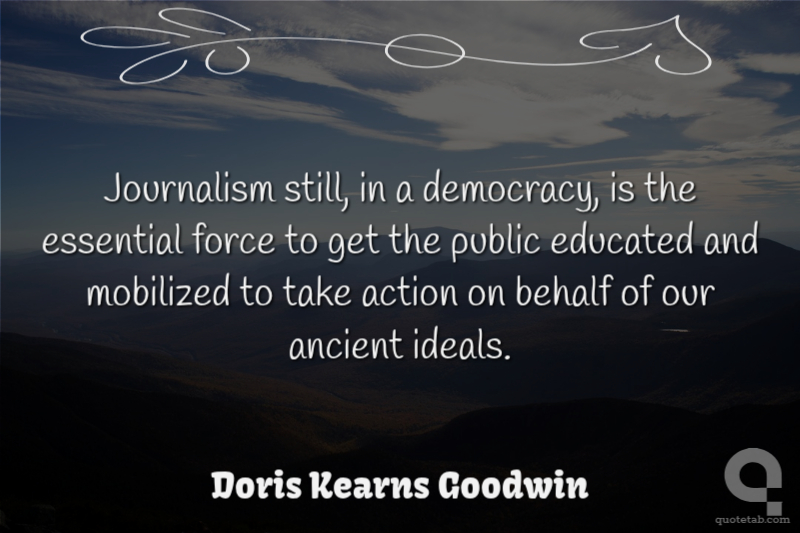 Journalism still, in a democracy, is the essential force to get the public educated and mobilized to take action on behalf of our ancient ideals. Doris Kearns Goodwin