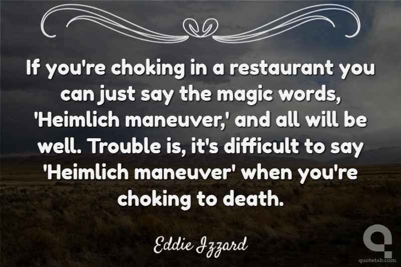 If you're choking in a restaurant you can just say the magic words, 'Heimlich maneuver,' and all will be well. Trouble is, it's difficult to say 'Heimlich maneuver' when you're choking to death. Eddie Izzard