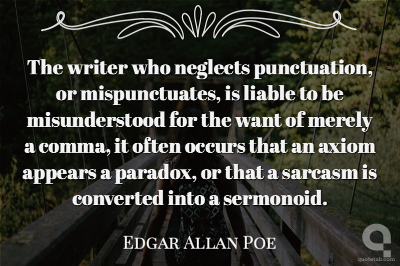 The writer who neglects punctuation, or mispunctuates, is liable to be misunderstood for the want of merely a comma, it often occurs that an axiom appears a paradox, or that a sarcasm is converted into a sermonoid. Edgar Allan Poe