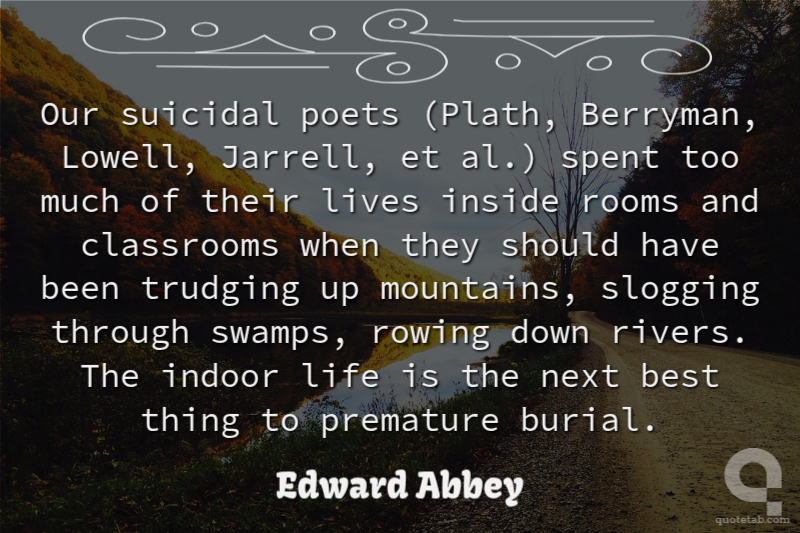 Our suicidal poets (Plath, Berryman, Lowell, Jarrell, et al.) spent too much of their lives inside rooms and classrooms when they should have been trudging up mountains, slogging through swamps, rowing down rivers. The indoor life is the next best thing to premature burial. Edward Abbey