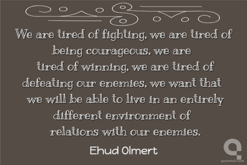 We are tired of fighting, we are tired of being courageous, we are tired of winning, we are tired of defeating our enemies, we want that we will be able to live in an entirely different environment of relations with our enemies. Ehud Olmert