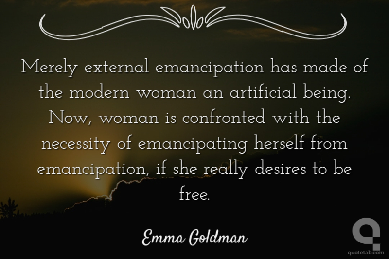 Merely external emancipation has made of the modern woman an artificial being. Now, woman is confronted with the necessity of emancipating herself from emancipation, if she really desires to be free. Emma Goldman