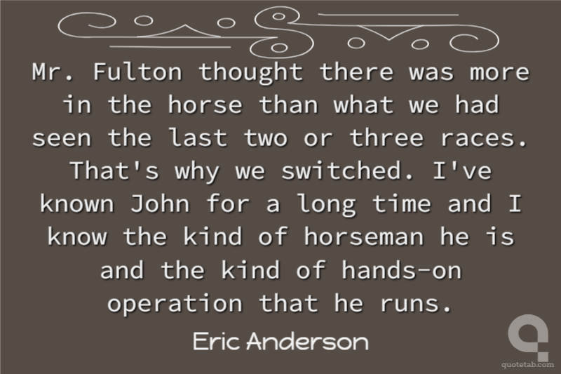 Mr. Fulton thought there was more in the horse than what we had seen the last two or three races. That's why we switched. I've known John for a long time and I know the kind of horseman he is and the kind of hands-on operation that he runs. Eric Anderson