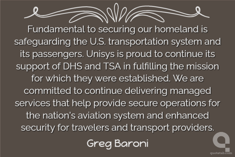 Fundamental to securing our homeland is safeguarding the U.S. transportation system and its passengers. Unisys is proud to continue its support of DHS and TSA in fulfilling the mission for which they were established. We are committed to continue delivering managed services that help provide secure operations for the nation's aviation system and enhanced security for travelers and transport providers. Greg Baroni