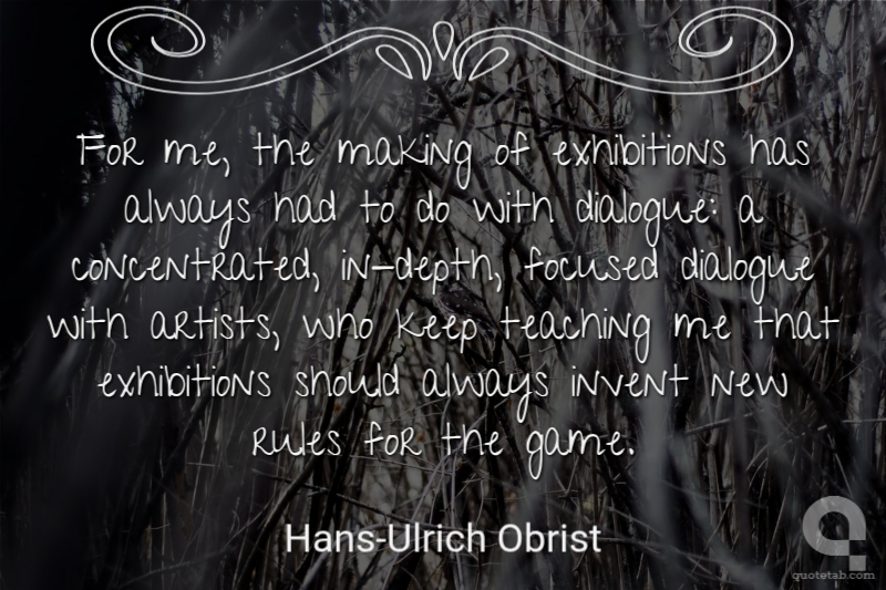 For me, the making of exhibitions has always had to do with dialogue: a concentrated, in-depth, focused dialogue with artists, who keep teaching me that exhibitions should always invent new rules for the game. Hans-Ulrich Obrist