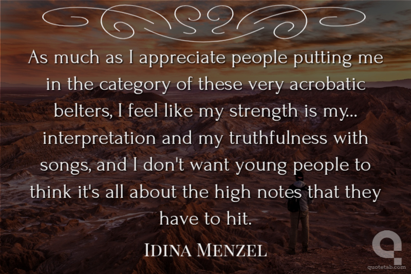 As much as I appreciate people putting me in the category of these very acrobatic belters, I feel like my strength is my... interpretation and my truthfulness with songs, and I don't want young people to think it's all about the high notes that they have to hit. Idina Menzel