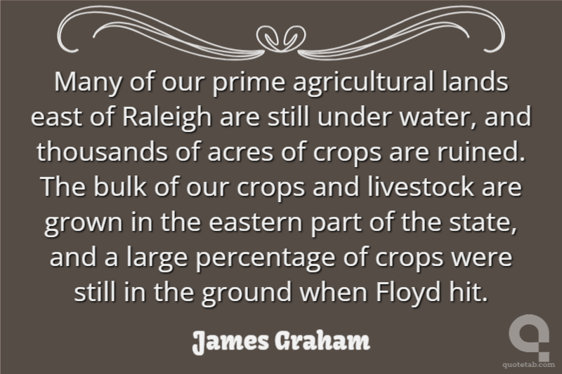 Many of our prime agricultural lands east of Raleigh are still under water, and thousands of acres of crops are ruined. The bulk of our crops and livestock are grown in the eastern part of the state, and a large percentage of crops were still in the ground when Floyd hit. James Graham