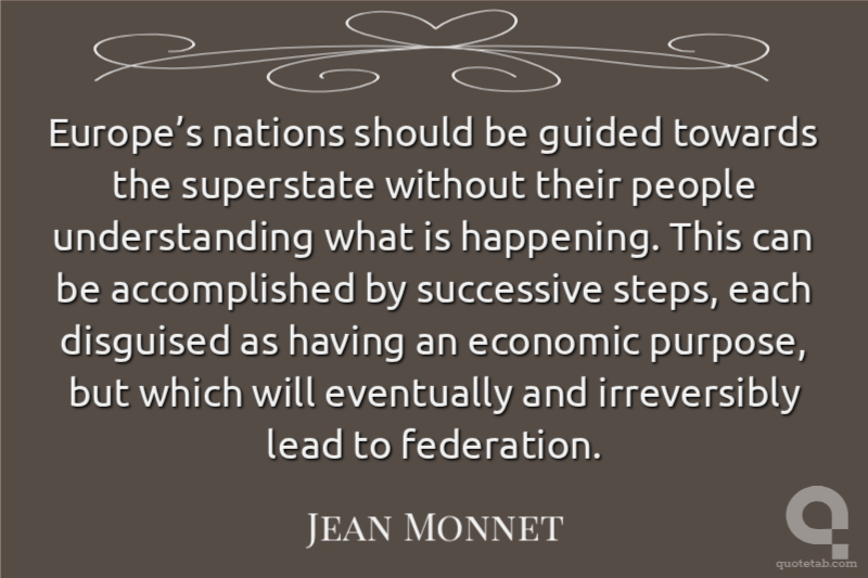 Europe’s nations should be guided towards the superstate without their people understanding what is happening. This can be accomplished by successive steps, each disguised as having an economic purpose, but which will eventually and irreversibly lead to federation. Jean Monnet