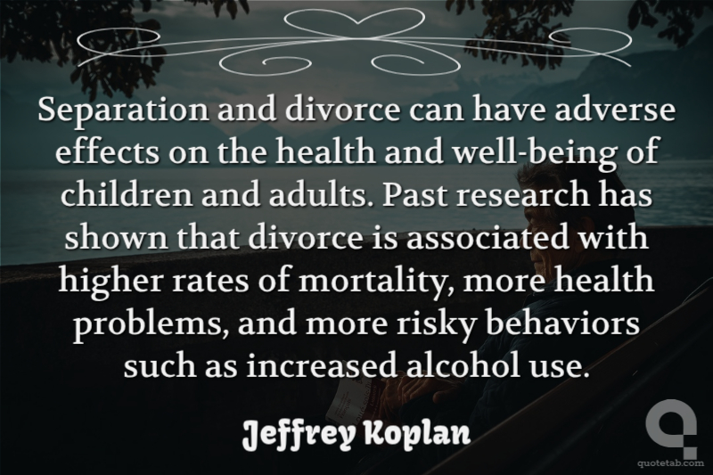 Separation and divorce can have adverse effects on the health and well-being of children and adults. Past research has shown that divorce is associated with higher rates of mortality, more health problems, and more risky behaviors such as increased alcohol use. Jeffrey Koplan