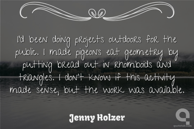 I'd been doing projects outdoors for the public. I made pigeons eat geometry by putting bread out in rhomboids and triangles. I don't know if this activity made sense, but the work was available. Jenny Holzer