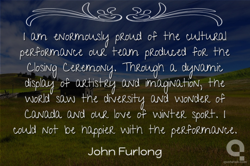 I am enormously proud of the cultural performance our team produced for the Closing Ceremony. Through a dynamic display of artistry and imagination, the world saw the diversity and wonder of Canada and our love of winter sport. I could not be happier with the performance. John Furlong