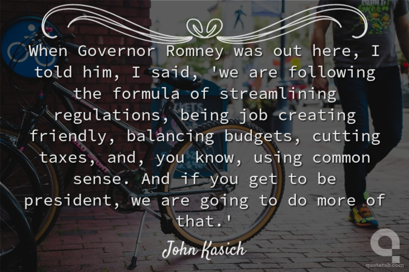 When Governor Romney was out here, I told him, I said, 'we are following the formula of streamlining regulations, being job creating friendly, balancing budgets, cutting taxes, and, you know, using common sense. And if you get to be president, we are going to do more of that.' John Kasich