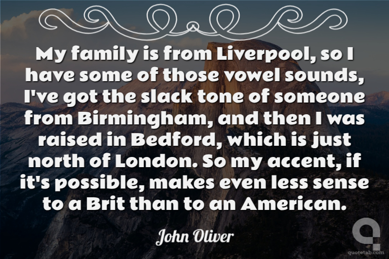 My family is from Liverpool, so I have some of those vowel sounds, I've got the slack tone of someone from Birmingham, and then I was raised in Bedford, which is just north of London. So my accent, if it's possible, makes even less sense to a Brit than to an American. John Oliver