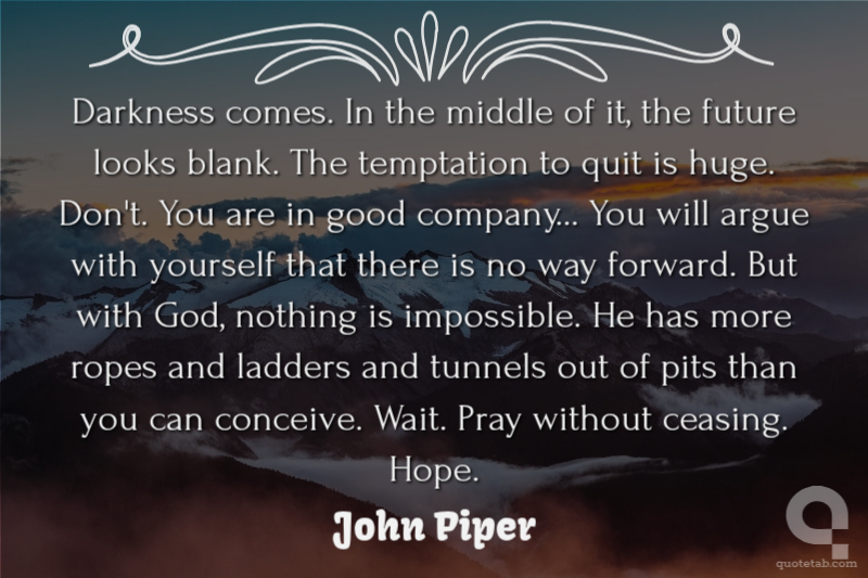 Darkness comes. In the middle of it, the future looks blank. The temptation to quit is huge. Don't. You are in good company... You will argue with yourself that there is no way forward. But with God, nothing is impossible. He has more ropes and ladders and tunnels out of pits than you can conceive. Wait. Pray without ceasing. Hope. John Piper