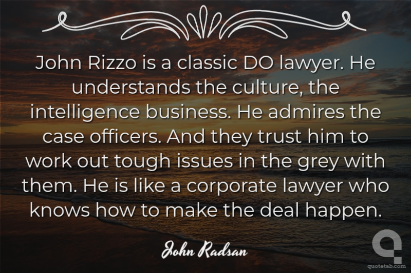 John Rizzo is a classic D.O. lawyer. He understands the culture, the intelligence business. He admires the case officers. And they trust him to work out tough issues in the gray with them. He is like a corporate lawyer who knows how to make the deal happen. John Radsan