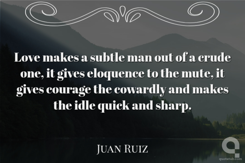 Love makes a subtle man out of a crude one, it gives eloquence to the mute, it gives courage the cowardly and makes the idle quick and sharp. Juan Ruiz