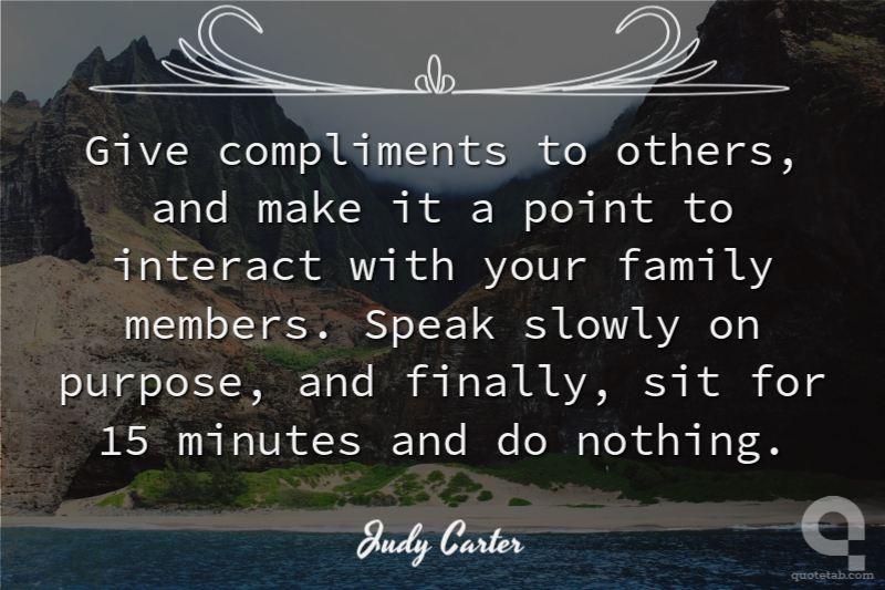 Give compliments to others, and make it a point to interact with your family members. Speak slowly on purpose, and finally, sit for 15 minutes and do nothing. Judy Carter