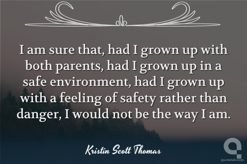 I am sure that, had I grown up with both parents, had I grown up in a safe environment, had I grown up with a feeling of safety rather than danger, I would not be the way I am. Kristin Scott Thomas