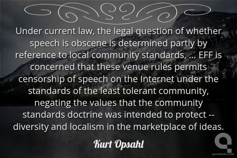 Under current law, the legal question of whether speech is obscene is determined partly by reference to local community standards, ... EFF is concerned that these venue rules permits censorship of speech on the Internet under the standards of the least tolerant community, negating the values that the community standards doctrine was intended to protect -- diversity and localism in the marketplace of ideas. Kurt Opsahl