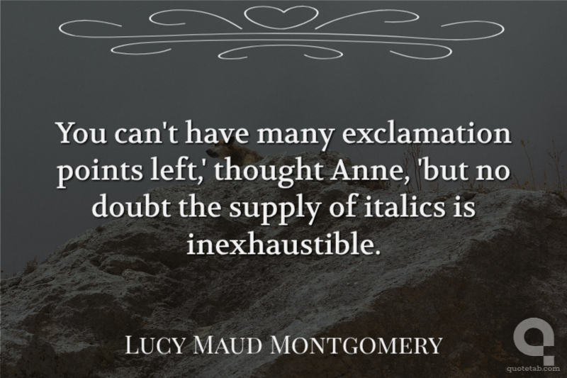 You can't have many exclamation points left,' thought Anne, 'but no doubt the supply of italics is inexhaustible. Lucy Maud Montgomery