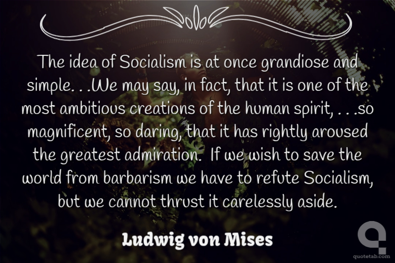 The idea of Socialism is at once grandiose and simple. . .We may say, in fact, that it is one of the most ambitious creations of the human spirit, . . .so magnificent, so daring, that it has rightly aroused the greatest admiration. If we wish to save the world from barbarism we have to refute Socialism, but we cannot thrust it carelessly aside. Ludwig von Mises