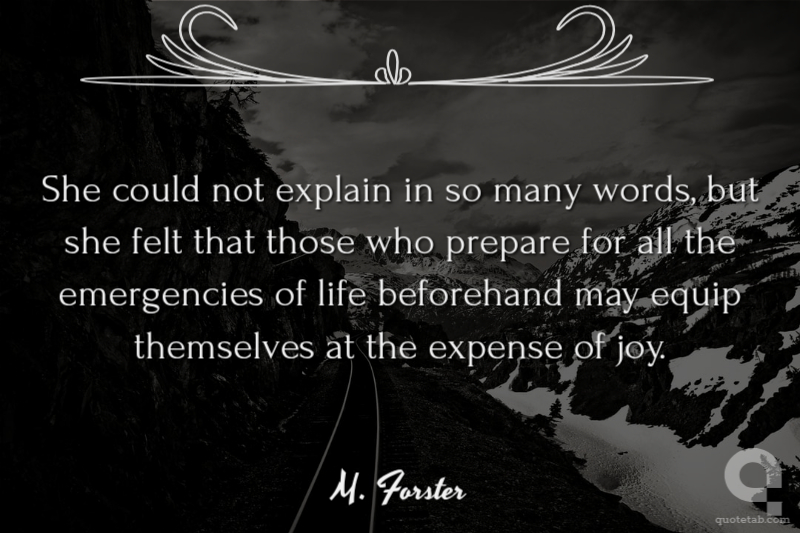 She could not explain in so many words, but she felt that those who prepare for all the emergencies of life beforehand may equip themselves at the expense of joy. M. Forster