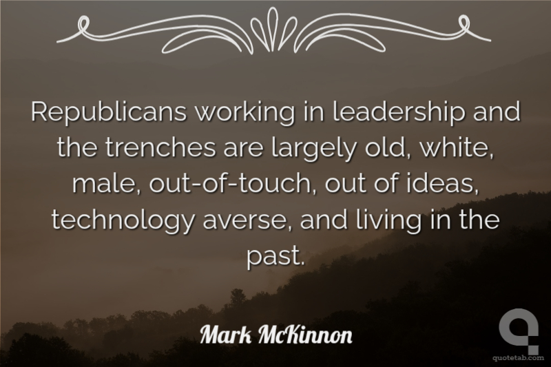 Republicans working in leadership and the trenches are largely old, white, male, out-of-touch, out of ideas, technology averse, and living in the past. Mark McKinnon