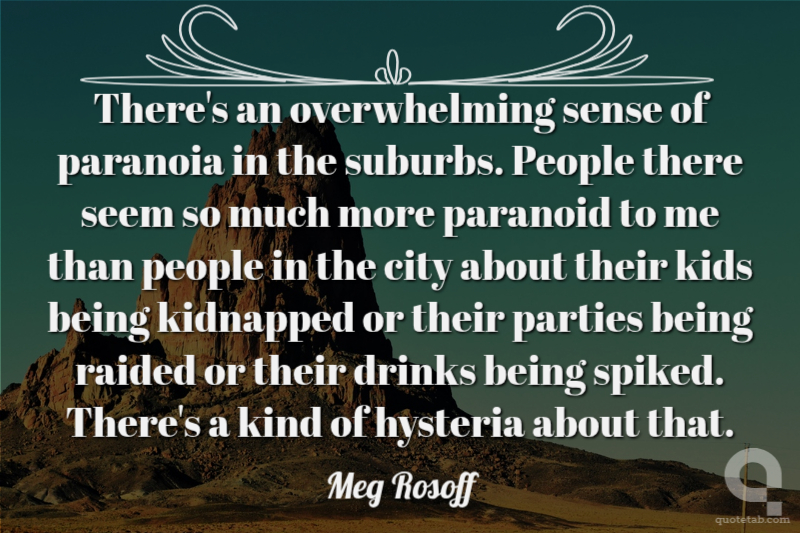 There's an overwhelming sense of paranoia in the suburbs. People there seem so much more paranoid to me than people in the city about their kids being kidnapped or their parties being raided or their drinks being spiked. There's a kind of hysteria about that. Meg Rosoff