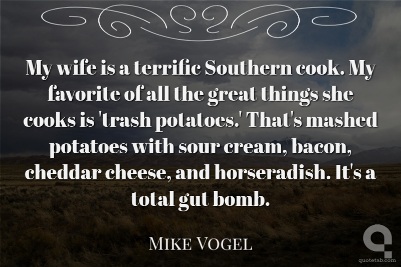 My wife is a terrific Southern cook. My favorite of all the great things she cooks is 'trash potatoes.' That's mashed potatoes with sour cream, bacon, cheddar cheese, and horseradish. It's a total gut bomb. Mike Vogel