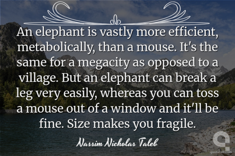 An elephant is vastly more efficient, metabolically, than a mouse. It's the same for a megacity as opposed to a village. But an elephant can break a leg very easily, whereas you can toss a mouse out of a window and it'll be fine. Size makes you fragile. Nassim Nicholas Taleb