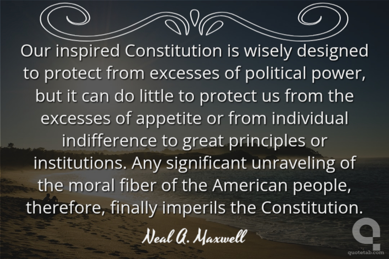 Our inspired Constitution is wisely designed to protect from excesses of political power, but it can do little to protect us from the excesses of appetite or from individual indifference to great principles or institutions. Any significant unraveling of the moral fiber of the American people, therefore, finally imperils the Constitution. Neal A. Maxwell
